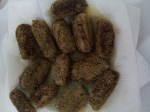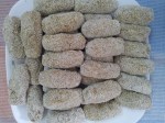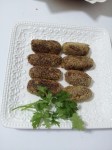 - Shape the mince paste into small cylindrical rolls and roll in rawa to coat.