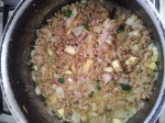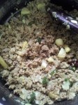 - Combine ingredients upto turmeric powder, add salt, ¼ cup water and cook till almost dry. Set aside to cool down a bit.