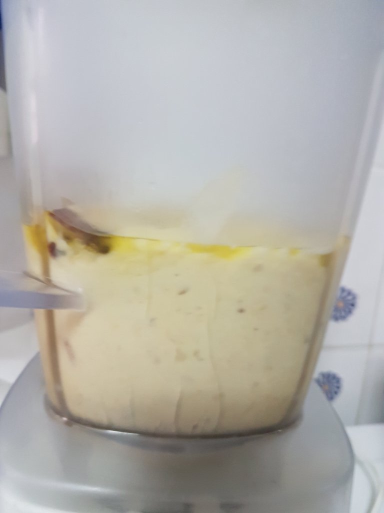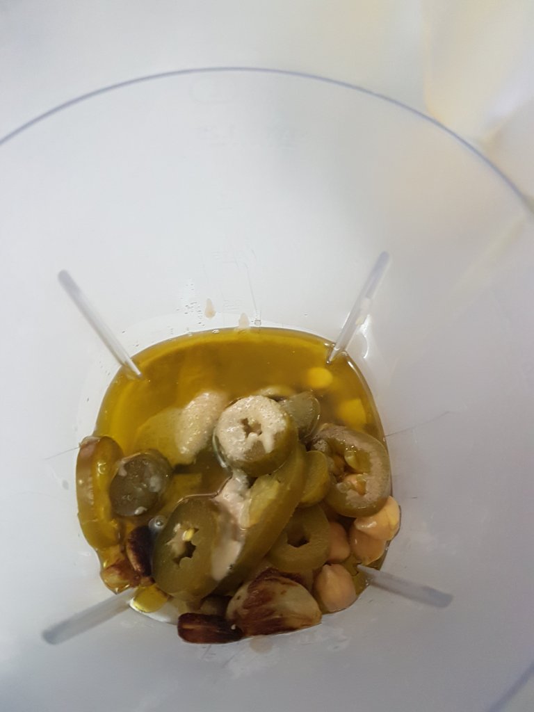 Add the boiled chickpeas, ¼ cup of the channa liquer, roasted garlic, jalapenos, salt, lemon juice and half of the olive oil to a mixer and blend till smooth. Add some more channa liquer or olive oil if difficult to grind.