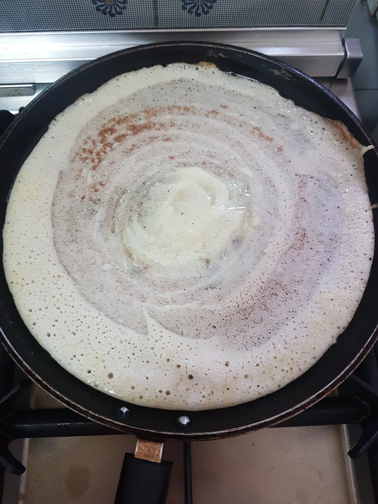 - When half done pour a 1/2 tsp ghee over the cetre and the edges of the dosa.