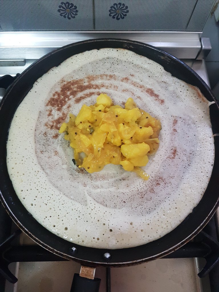 - Place two ladles of the prepared masala bhaji over the centre of the dosa.