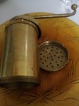 - Take a vessel with some chilled water and ice. Press the cornflour paste (when still hot) through a ghatia press (shown below) directly into the chilled water and leave to set in the refrigerator.